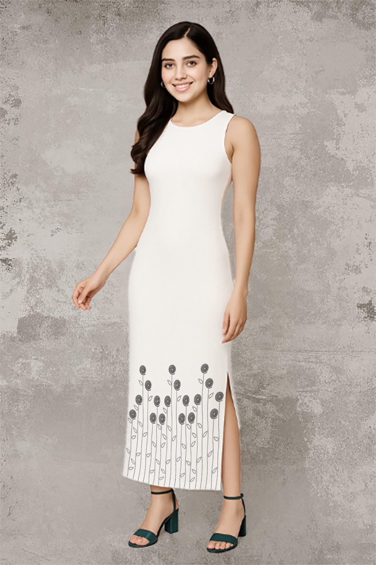 Crafted from 220 GSM poly-spandex, this dress delivers a smooth finish, exceptional stretch, and shape retention that flatters every move. The skin-fit silhouette with a chic side slit adds just the right balance of sophistication and freedom, making it as bold as it is comfortable.