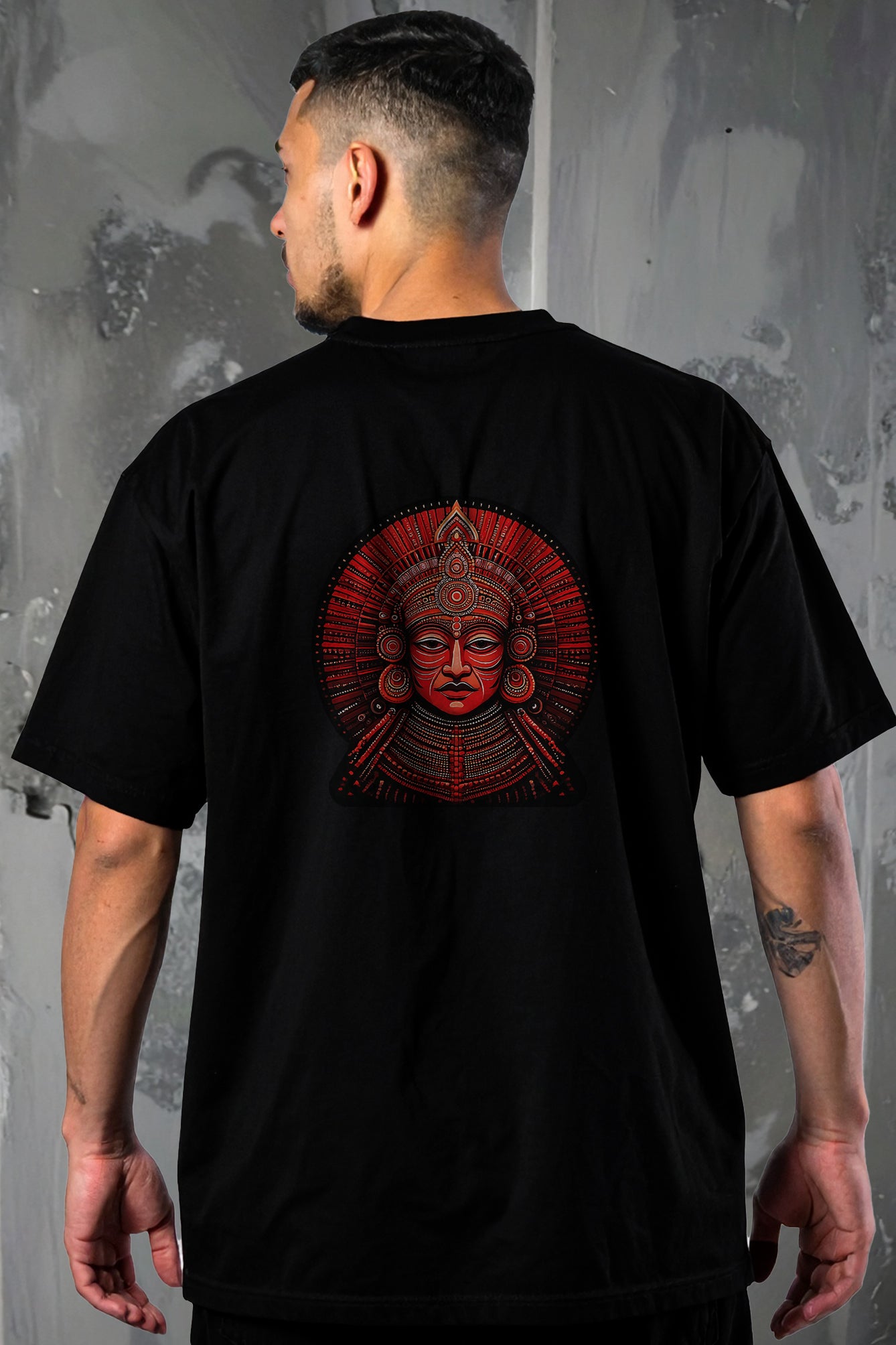 Crafted from 100% cotton with a structured 180 GSM, this tee is made to carry presence — not weight. The oversized fit with extended length and dropped shoulders creates silhouette with intention, echoing the bold stance of ritual, rhythm, and raw identity.